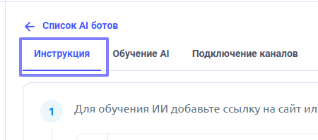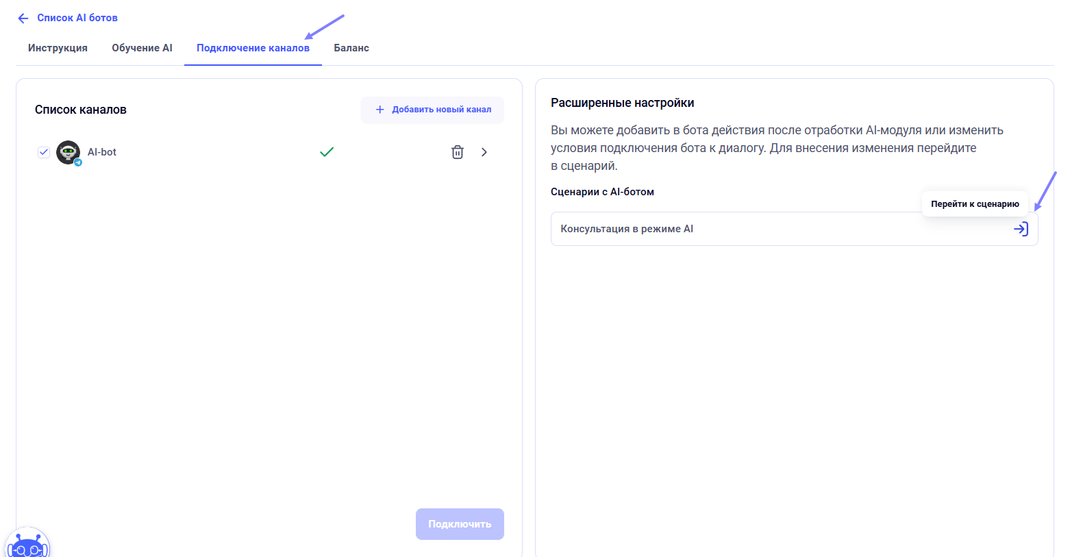 Здесь можно подключить канал, если ранее вы не подключили в разделе "Каналы", или выбрать нужный канал, к которому нужно подключить AI-бота. Инструкция по подключению мессенджера ждет вас [в этом](https://docs.smartbotpro.ru/nachalo-raboty/kak-podklyuchit-messendzher) гайде😊