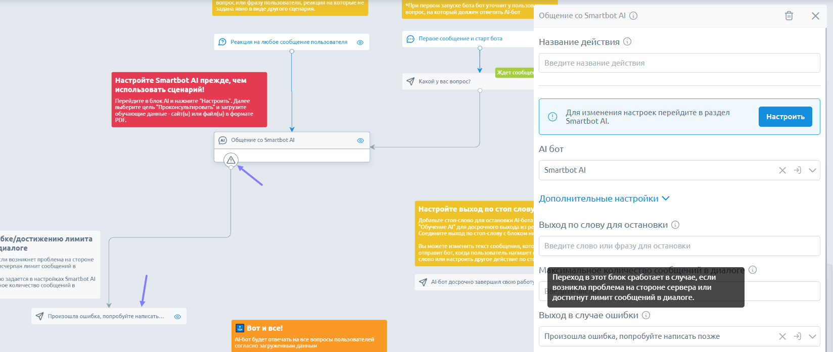 Можно настроить ответ пользователю на случай, если при генерации ответа от AI бота произойдёт ошибка.