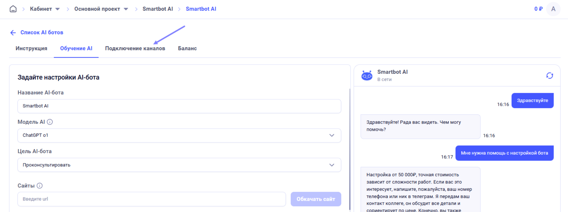 После того, как обучили бота, переходим в раздел "Подключение каналов".
