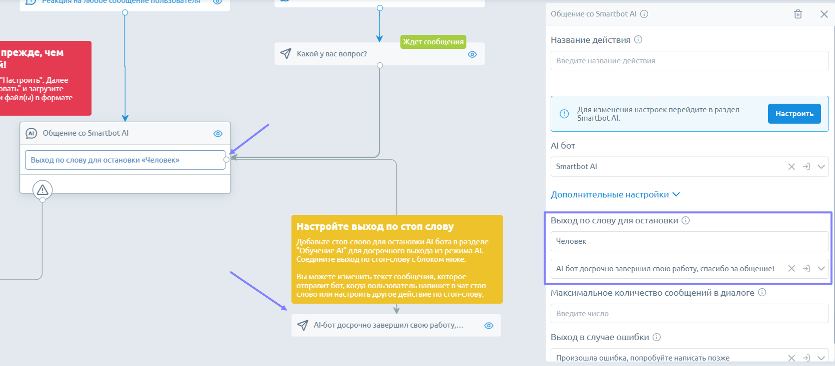 Можно настроить выход из режима AI по слову, например "Человек" и соединить с блоком "Отправить сообщение". Когда пользователь будет общаться с AI ботом и напишет слово "Человек", бот отправит сообщение о том, что он завершил свою работу.