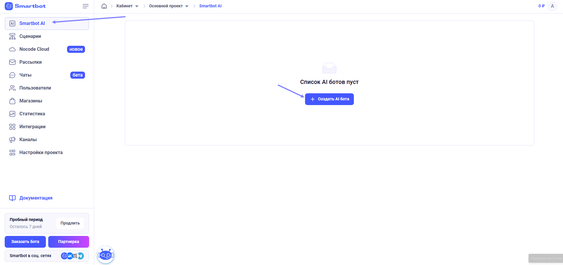 * Переходим в раздел “Smartbot AI” в нужном проекте, нажимаем "Создать AI бота"