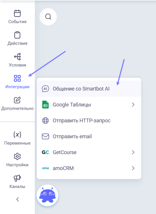 Если у вас уже есть сценарий, в который идеально встроится искусственный интеллект, то вы можете выбрать блок “Общение с Smartbot AI” в панели, во вкладке “Интеграции” и настроить вручную: