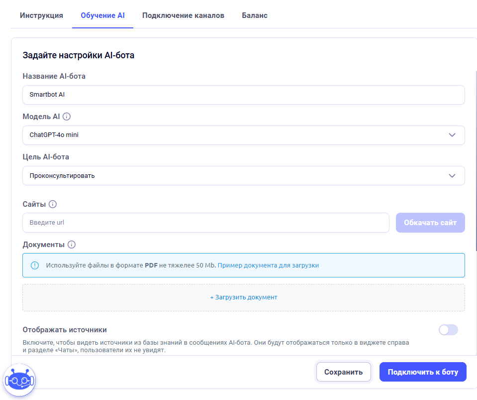 * обкачать сайт компании и загрузить PDF документ для обучения бота (как указано в примере, без таблиц, нумерованных и маркированных списков, изображений)