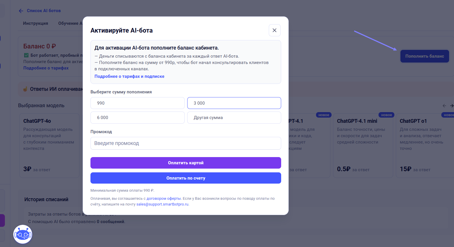 Подробнее про тарификацию можно почитать в отдельной [статье](https://docs.smartbotpro.ru/dokumenty/podpiska-i-tarify/kak-rabotaet-oplata-ai-botov).