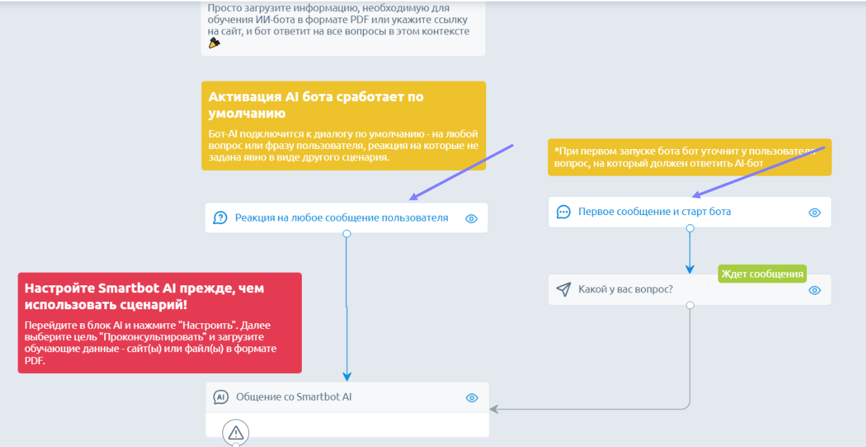 В шаблоне, когда пользователь пишет первое сообщение и запускает бота, бот отправляет сообщение "Какой у вас вопрос?" и переводит на AI бота, после чего реагирует на любое сообщение непредусмотренное другими сценариями.&#x20;