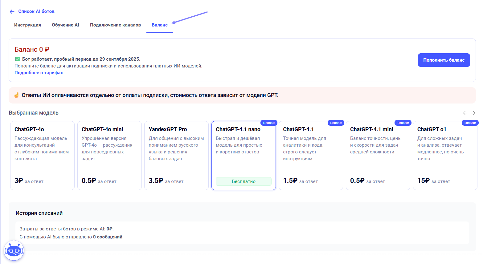 Здесь вы найдете краткое описание моделей AI и стоимость ответов. Также есть история списаний, где отображается затраченная сумма с баланса и количество ответов от AI бота за весь период.&#x20;