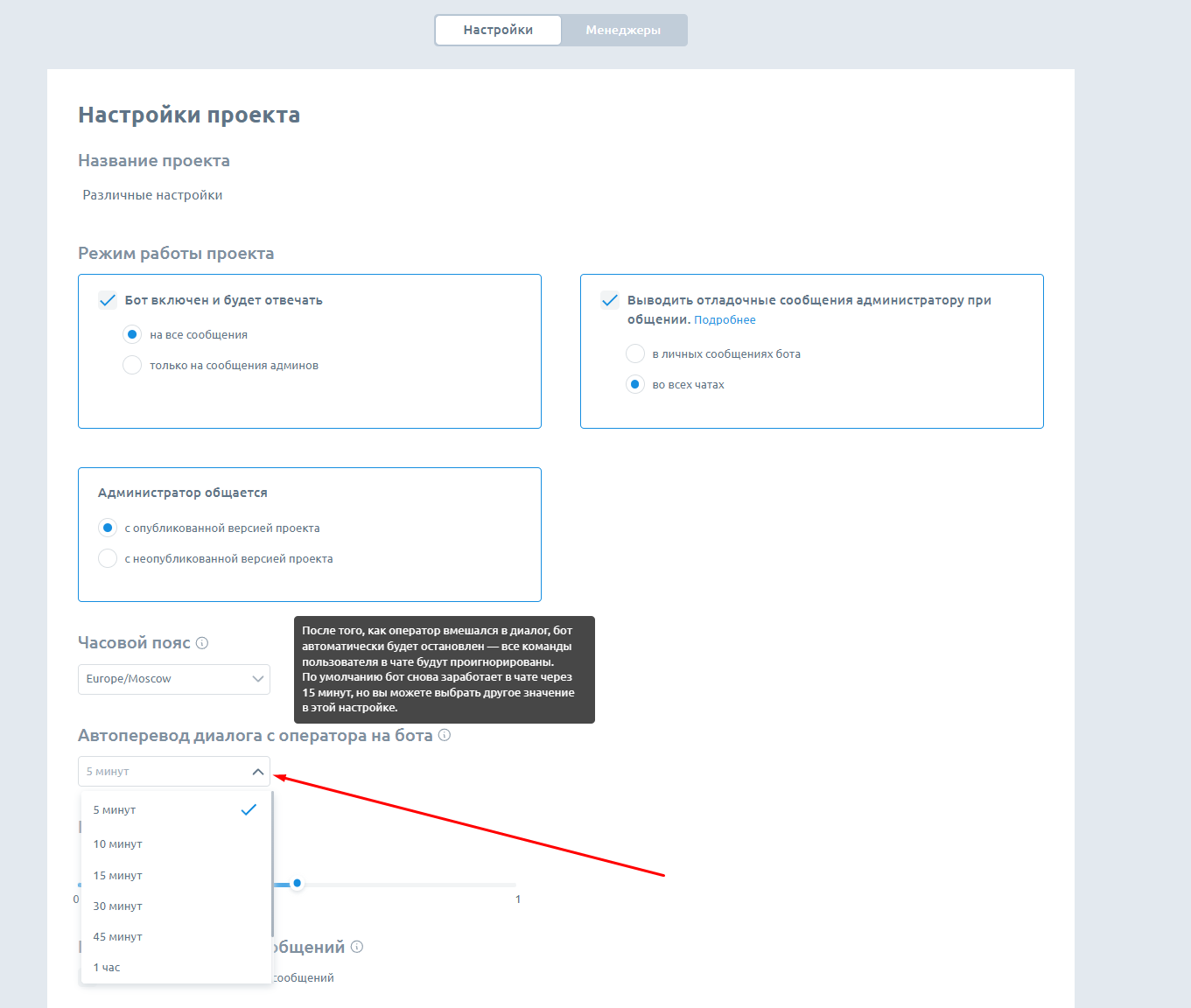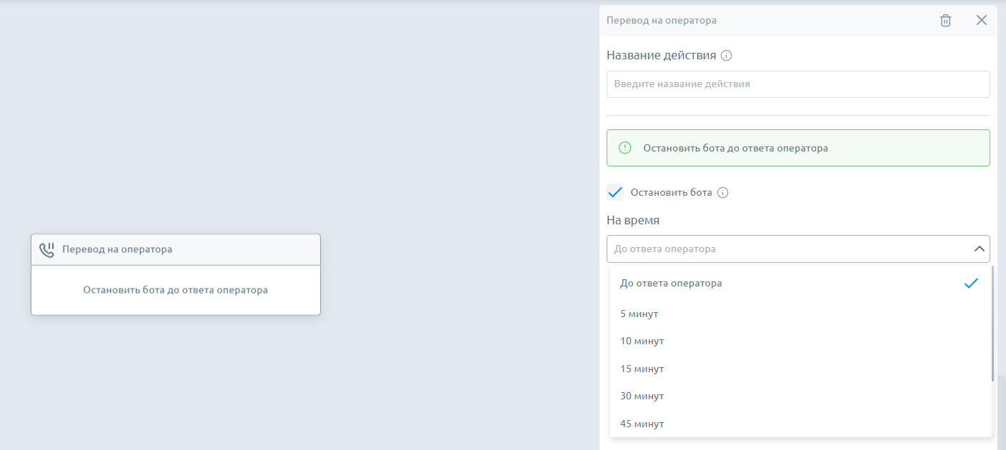 Можно выбрать временной промежуток, после которого бот все-таки вернется в диалог, если живой человек не успеет подключиться. Однако при вмешательстве оператора он все равно отключится и будет ждать.