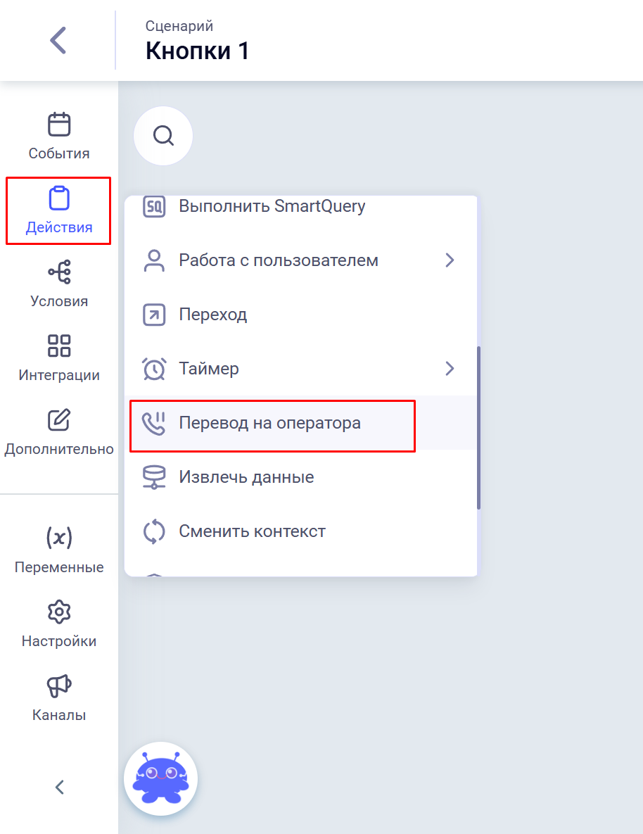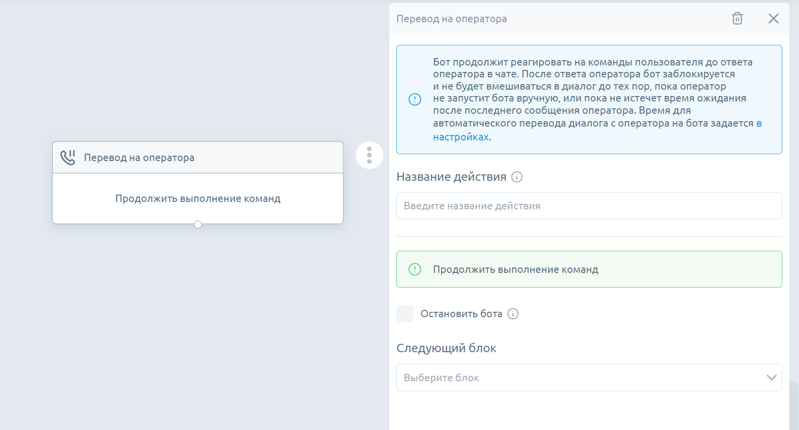 <figure><img src="https://4058588211-files.gitbook.io/~/files/v0/b/gitbook-x-prod.appspot.com/o/spaces%2FvTd8XmFMqkqZga7zhLuk%2Fuploads%2FOM3ISoj1tUbpUFsd1Vve%2Fimage.png?alt=media&#x26;token=7ef24b33-73da-4c1c-9305-8255a862e33d" alt="" width="563"><figcaption><p>Перевод на оператора - это блок-действие</p></figcaption></figure>