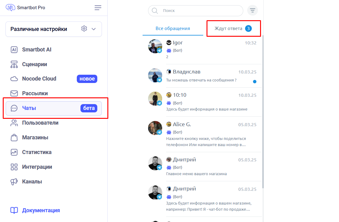 1. Отметить пользователя, как ожидающего ответ в разделе "Чаты"&#x20;