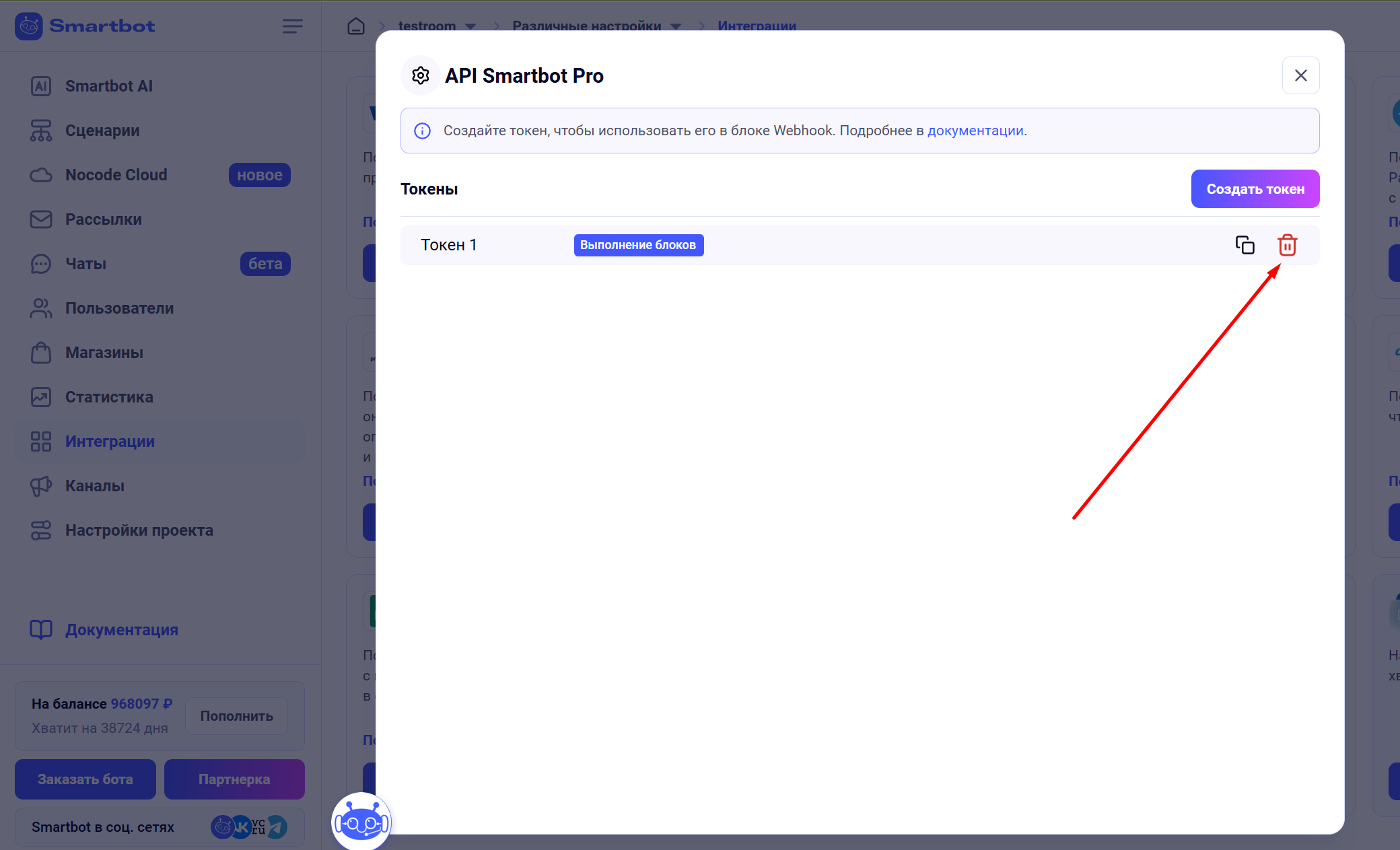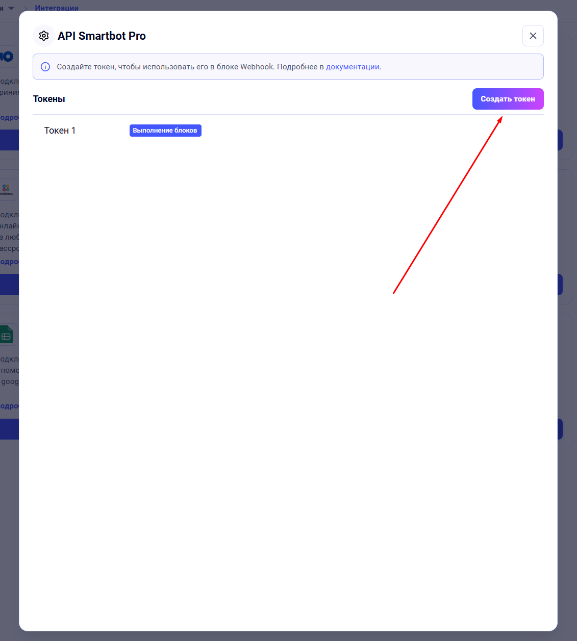 Создать новый токен и увидеть список всех токенов проекта можно в разделе «Интеграции».  &#x20;